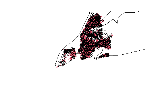 nyc_map_plot <- plot(nyc_map, xlim= c(min(shooting2$Longitude),max(shooting2$Longitude)), ylim= c(min(shooting2$Latitude),max(shooting2$Latitude))) + points(shooting2$Longitude, shooting2$Latitude, col= factor(shooting2$MURDER))