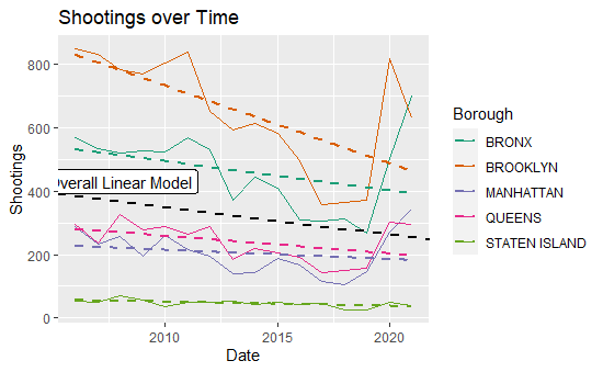 labs(x="Date", y="Shootings", title="Shootings over Time", color = "Borough") +