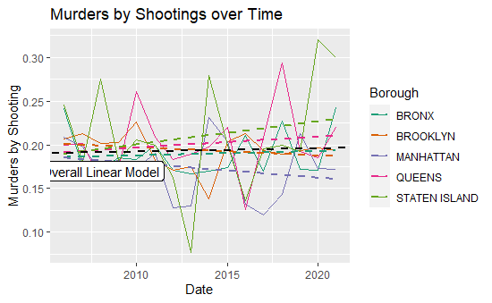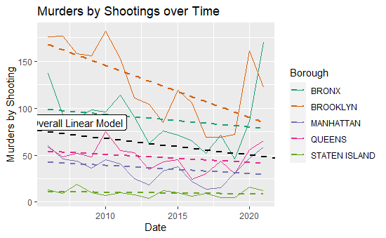 labs(x="Date", y="Murders by Shooting", title="Murders by Shootings over Time", color = "Borough") +
