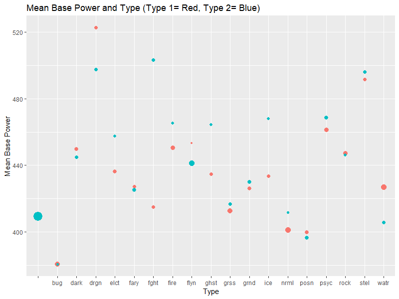 geom_point(poketype2, mapping=aes(x=type2, y=`mean`, size=n, color="Type 2"))+